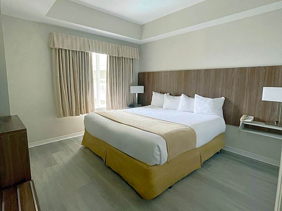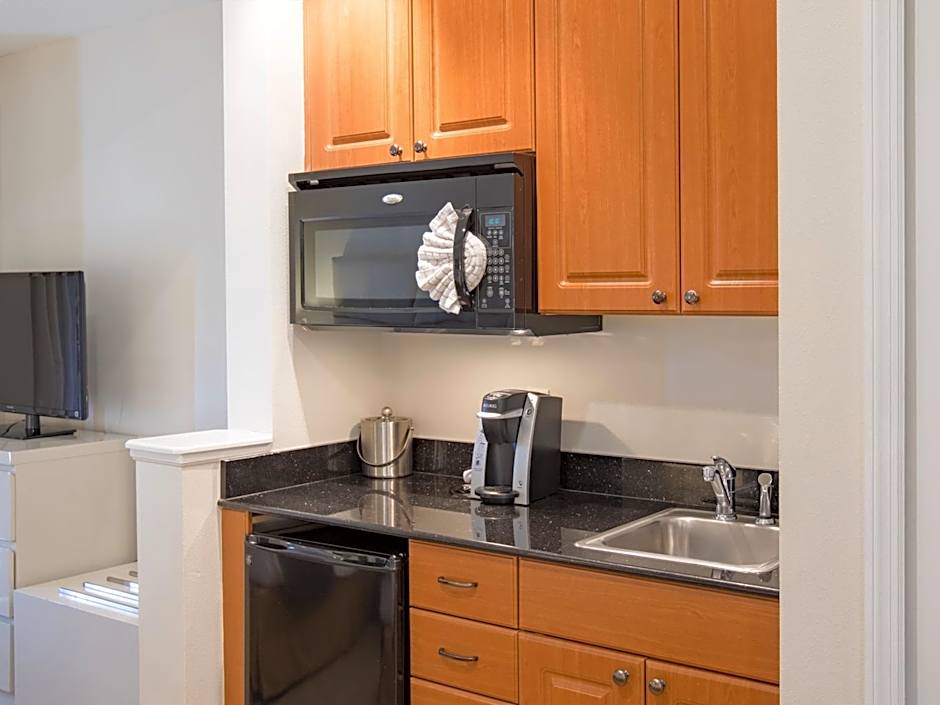 This suite includes a microwave and small refrigerator. A living area and flat-screen TV are also included.